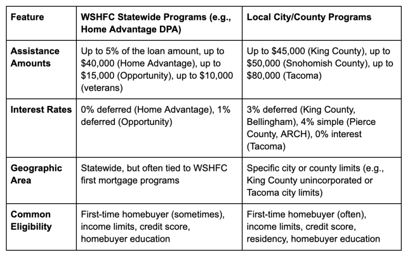 - Other local programs: Pierce County (up to $24,900), ARCH East King County (up to $30,000), and the city of Pasco also offer assistance.